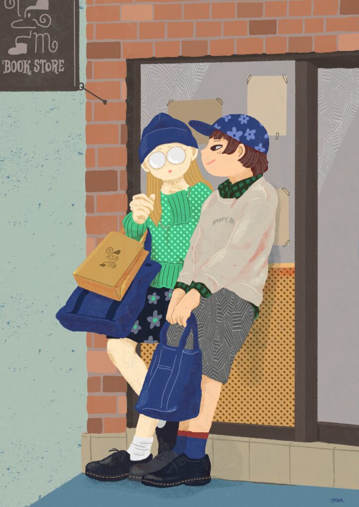 Illustration トートバック用の三姉妹イラストスマートフォンケース特集ページ モックアップ結婚式席次表のイラスト、デザイン「春」をテーマに新入学のイメージ梅雨の学校と生徒ファッションイラストレーション買い物するカップルスマホをいじる男性本を読む女性靴料理をするキツネ食材を運ぶウサギ
